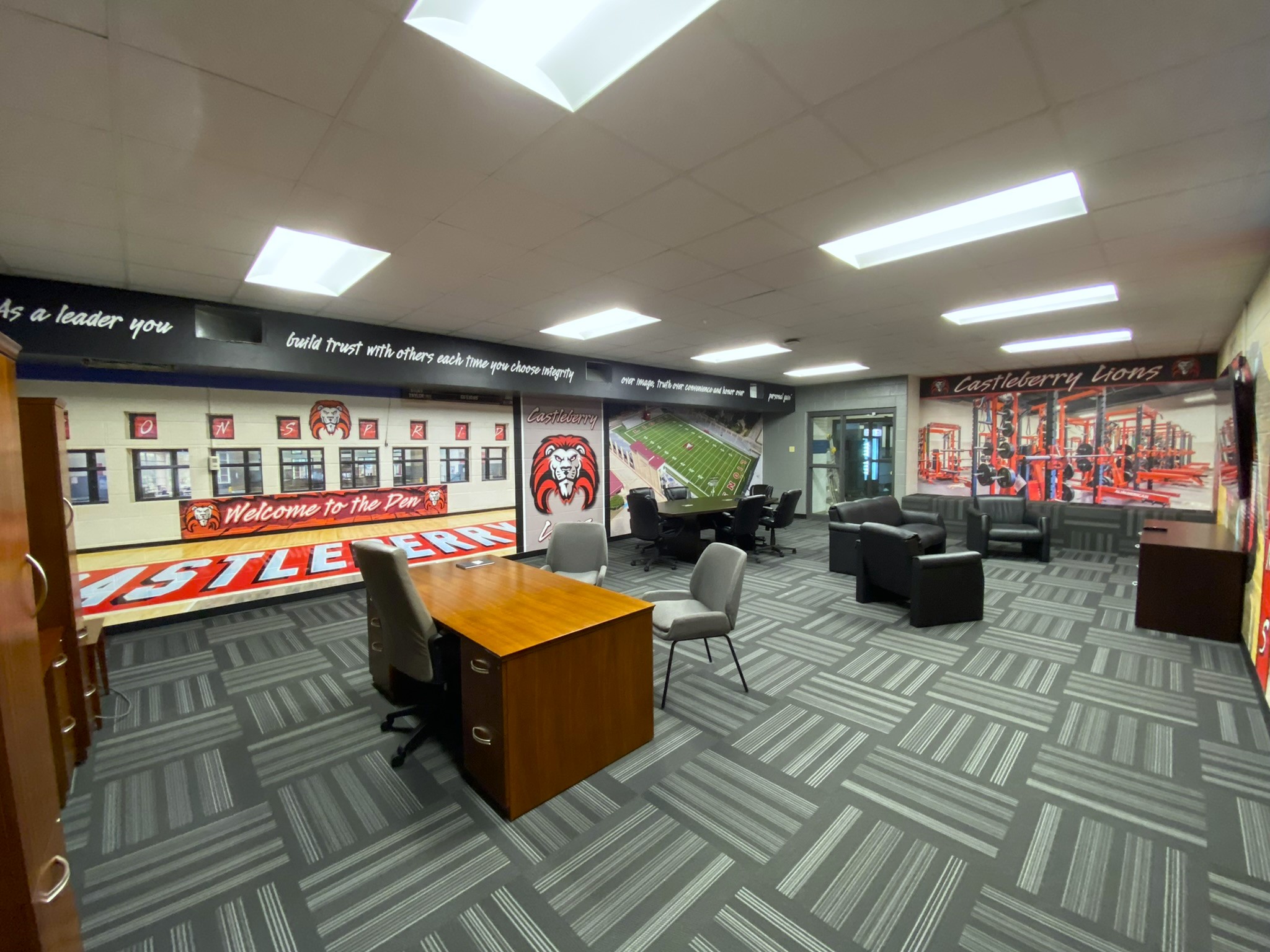 Wall graphics are perfect for locker rooms, weight rooms, indoor practice facilities, hallways, meeting rooms, libraries, main entrances, and cafeterias.
